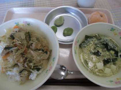 今日の「ゆでそらまめ」は、一年生がさやむきをしてくれました。「そらまめ」は漢字で書くと お空の空に豆とかきますが、その理由は豆の「さや」が空を向いて実るから空豆」という名前が付きました。普通のさやは下を向いて実るものが多く、空を向いて実る「そらまめ」はとても特徴のある豆です。そらまめの栄養はたんぱく質やミネラルがバランスよく、たっぷり入っているので、バランス栄養食と言っても良い食材です。旬の時期は4月から6月なので、今がまさに旬の食べ物です。今日は、1年生のみなさんが朝から全校生徒分の全部で420房ものたくさんの空豆を一生懸命にさやむきしてくれたものです。1年生のみなさんありがとうございました。