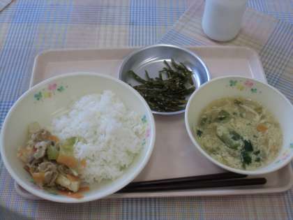 今日の「茎わかめのしょうが炒め」はその名前の通りわかめの茎の部分です。茎わかめはわかめの生えているところではどこでも収穫できますが、わかめほどあまり食べられることがありません。ですが、茎わかめはとても栄養があり、カルシウム・ビタミン・ミネラルがたくさん入っていて、風邪などの病気から体を守ってくれる働きがあります。また、わかめの中で一番おいしいところが「くき」と言われ、煮物・炒め物・汁物の具などいろいろな食べ方があります。