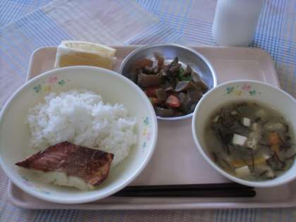 「赤魚」は「あこうだい」とも言い、あざやかな赤い色をしていることから名前が付きました。脂肪が少なく、からだを作るたんぱくしつが多く含まれています。そして、記憶力や集中力を高めるビタミンB12という栄養素もたくさん含まれています。これは、かたこりや腰の痛みをやわらげてくれたり、血液を作るのを助けることもします。今日は、「西京焼き」といって、みそやみりんなどの調味料に漬けこんで焼きました。