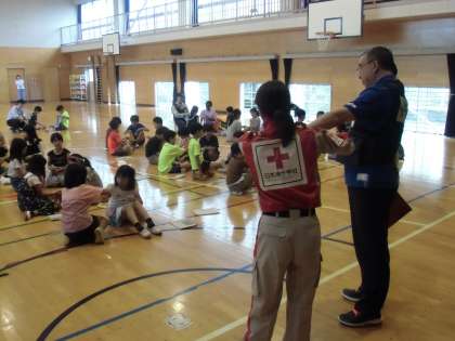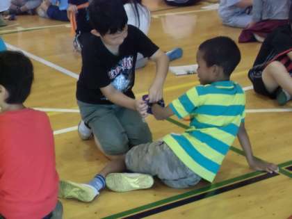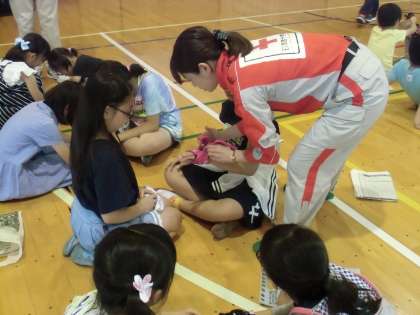 本日は防災教室を実施しました。4年〜6年は日本赤十字社東京支部から7名の講師を迎え、「避難所で役立つ技術、身近なもので応急手当」の実技をしました。