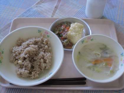 今日は、奈良県の郷土料理献立でした。「奈良茶飯」は、お米と大豆をほうじ茶で炊いたご飯です。元々は、奈良にある東大寺や興福寺のお坊さんたちが食べていたものが始まりだそうです。また、奈良県では、地域の特色豊かな大豆が作られています。栽培されている品種の「サチユタカ」は、タンパク質を多く含むため豆腐作りにぴったりで、栽培しやすく、たくさん収穫できるそうです。そんな奈良県にちなんで、お豆腐で、「揚げ出し豆腐の野菜あんかけ」を作りました。そして、肉や野菜がたっぷりの鍋に牛乳を入れたものを「飛鳥鍋」というため、給食では飛鳥鍋を汁にしていただきました。