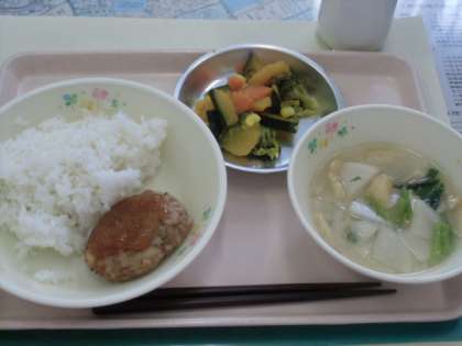 今日は、れんこんの入ったハンバーグでした。れんこんを粗みじん切りにしてシャキシャキした食感を味わって食べました。温野菜サラダは、はちみつを入れて作りました。かぼちゃとはちみつの甘みがあって食べやすいサラダでした。