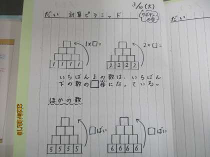 3月10日(火)2年生のみなさんへ 公開日 2020/03/10 更新日 2020/03/10 第2学年 みなさんこんにちは。きのうしょうかいした計算ピラミッドは、ちょうせんできましたか?ピラミッドのいちばん下の数といちばん上の数をくらべてみると、あるきまりが見えてきます。分かった人は、ほかの数でもしらべてみて「自分学習ノート」にまとめてみよう! 今日は口の体そう、早口ことばをしょうかいします。3回れんぞく言えるかな? いいね(0)