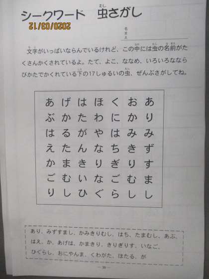 2年生のみなさん、こんにちは。今日は雲一つない、気もちのいい空が広がっています。温かい今日は虫たちもかっぱつにうごき出しそうです。ということで、今日は虫のことばさがしを出だいします。たて、よこ、ななめ、いろいろなならび方で17しゅるいの虫がかくれています。下の四角の中のことばをヒントにさがしてみましょう。きのうのことばクロスの答えもはっぴょうするので、かくにんしてみてね。