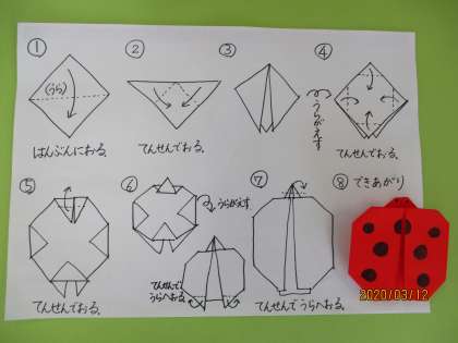 今日は、折り紙でてんとう虫を作りました。作り方も載せるので、作ってみてください。