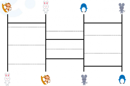 ・あみだくじと同じように線をなぞって、同じ動物どうしを結びます。