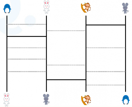 ・あみだくじと同じように線をなぞって、同じ動物どうしを結びます。