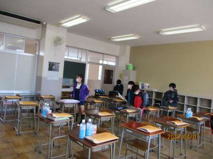 始業式は各教室。校長先生のお話も職員室からの放送で行いました。