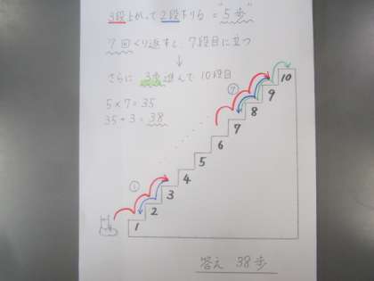 あなたは、10だんある階段の下に立っています。「3歩上がったら2歩下がる」というルールで階段を上るとき、一番上の段に行くまで、全部で何歩歩くでしょう?