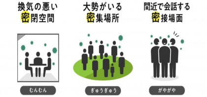 「密接」は、人とお話しするときは、「ガヤガヤ」と近づいて話をしないこと。と説明していました。