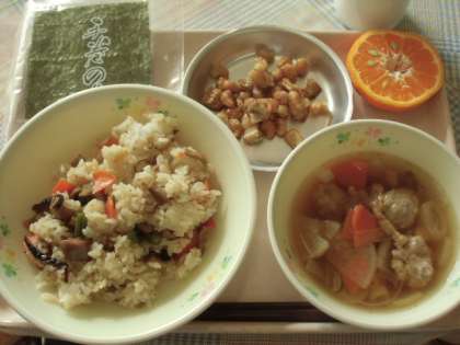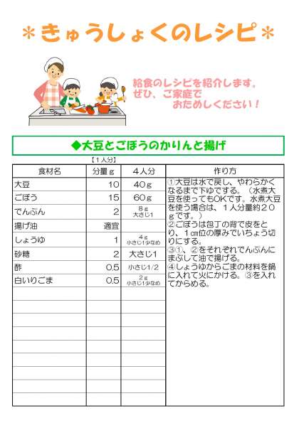 給食写真の小皿にあるのが、「大豆とごぼうのかりんと揚げ」です。2月に節分献立で給食に登場しました。