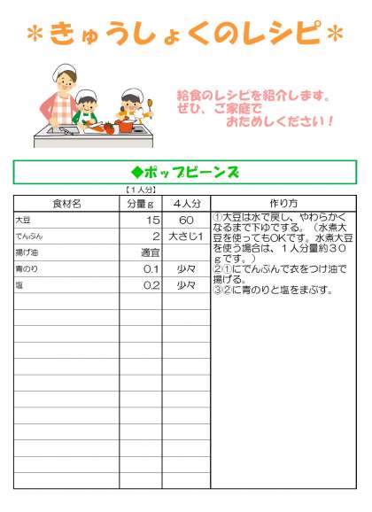 今日のレシピは、学校給食でよく登場する大豆料理の紹介です。大豆は、たんぱく質や鉄分、食物繊維などを多く含む栄養豊富な食材です。豆を使った料理は子どもたちには敬遠されがちですが、今日紹介するメニューは、2つとも上柚木小では人気の大豆メニューです。おやつ感覚で食べられるメニューなので、お時間あるときにおうちでもお試しください。