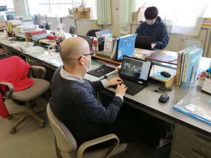 情報担当のおふたりの先生が学校と自宅でWeb 会議の調整を行っています。