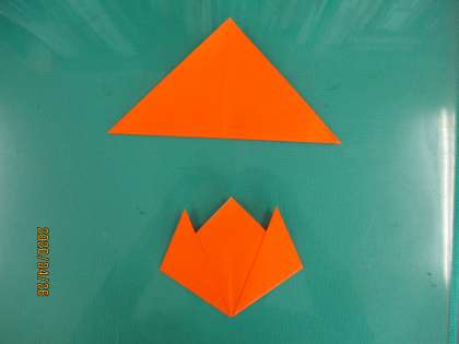 3 さんかくのはじをおりあげてかんせいです。