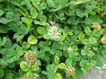 シロツメクサといっしょにうつっているのは、「ミツバチ」です。近くによるとブーンという羽音がはく力があってこわいので、これいじょう近くによれませんでした。いっしょうけんめいミツを集めていましたよ。