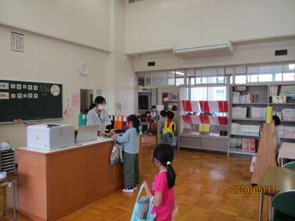 今日の登校日は、小雨が降っていて、傘をさしての登校でしたが、みんな上手に傘をくるくるまいて、傘立てに入れることができました。挨拶、健康観察の後、自己紹介を行いました。自分の名前と好きなことや物を発表しました。はじめての発表でしたので、緊張している人もいましたが、全員自己紹介ができました。はやくクラスの友達の顔と名前を覚えられたらいいなと思っています。学校探検もしました。保健室と職員室と図書室に行き、図書室では、本の返し方を覚えました。