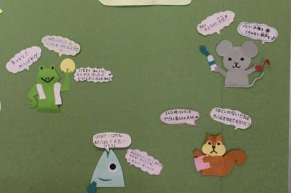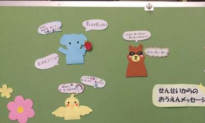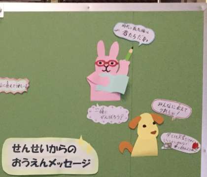 「ゆずっこポスト」と同じ場所に、先生方から上柚木小学校の児童のみなさんに向けて、「おうえんメッセージ」がはってあります。