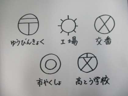 今日配られたみんなの課題を見せてもらったら、新しく地図記号の勉強が始まる学年がありました。先生は地図記号の形に注目して、仲間を集めてみました。どんな形をもつ仲間かわかるかな。□や△や〇など、身の回りには色んな形がかくれています。探してみてね。