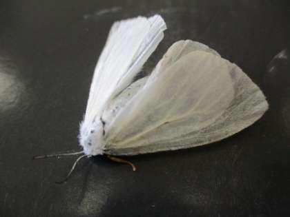 ヒラヒラと飛んでいるのでモンシロチョウの大量発生かと思い、観察してみるとモンシロチョウと少しちがいます。調べてみると「キアシドクガ」という蛾(ガ)の仲間でした。ドクガと名前につきますが、毒はないようです。