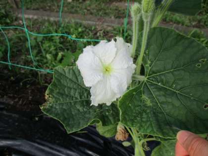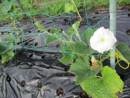 畑のヒョウタンとゴーヤもだいぶ大きくなりました。そして、今日、ヒョウタンに花がさいていました!白い大きな花でした。もうしおれているものもありました。さて、花がしおれた後は?
