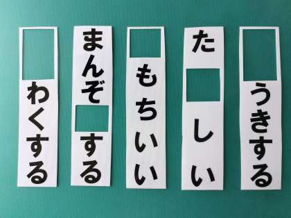おおるりでも、「きもちのことば」をがくしゅうすることがあります。「うれしい」「かなしい」「こわい」などを、いろいろなことばをつかってひょうげんします。うえのカードは、うれしいことばをあつめたものです。あいているところに、どんなもじをいれたらよいでしょうか?
