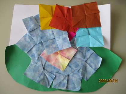かようびの かだいで、おりがみを たくさんおって、しゃしんの ように あじさいの おはなを つくったひとがいるので、しょうかいします。すてきな はなが できあがりましたね。