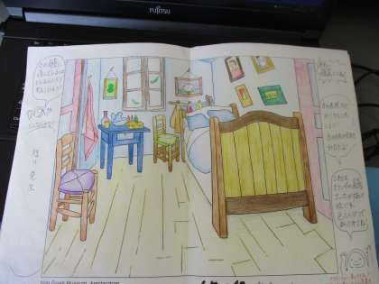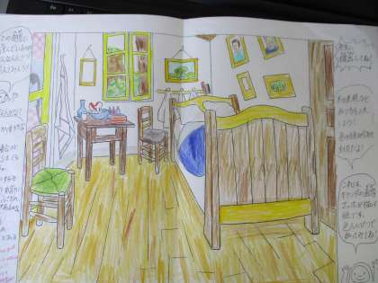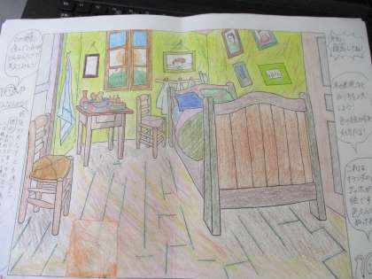 今日紹介するのは、オランダの画家、ファン・ゴッホの描いた「アルルの寝室」に6年生が自分のイメージで色をつけた作品です。
