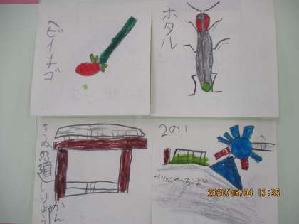 さて、生活科の「町たんけん」のかだいをさっそくもってきてくれた人がいるので、しょうかいします。しょくぶつ、虫、たてもの、いいですね。これからとりくむ人も、さんこうにしてください。