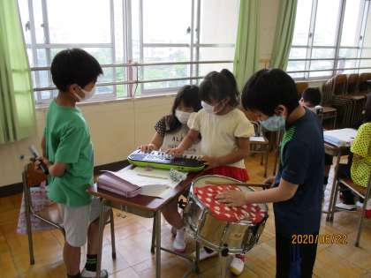 今日の音楽は、「まほうの音楽をつくろう」でした。グループごとにいろいろな楽器をつかって音楽づくりをしていました。初めて見たり聴いたりした楽器もあって、とても楽しそうに活動していました。どんなすてきな音楽ができるのか楽しみです。