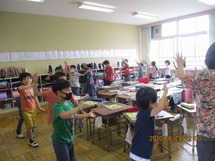「エースオブダイヤモンド」の曲に合わせてこうしんしたり、「とうしんドーイ」や「ドレミの歌」に合わせておどったりしました。体を大きくうごかしてとても楽しんでいました。