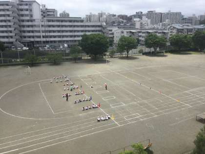 1年生が校庭で体育を行いました。様々な工夫をしながら子供たちが楽しみながら運動することができるようにしています。今日は少々蒸し暑かったですが、たくさん体を動かすことができました。