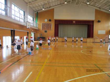 さーきっとを やりました。4かしょに わかれて、からだ じゃんけんを します。かったひとは、つぎの ばしょに いどうします。いどうするときに、けんぱーをしたり、すきっぷをしたり、ふらふーぷをしたり、ひくいへいきんだいをわたったりします。きょうは、はじめてやったので、やりかたを おぼえることが めあてでしたが、みんな やりかたを おぼえて、たのしむことが できましたね。からだを たくさん うごかすことも できました。らいしゅうも やりますよ。