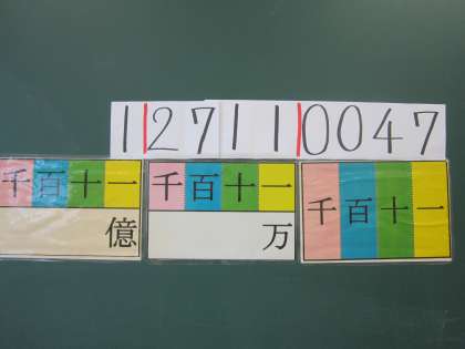 今日の4年生の授業では、「一億をこえる数」の学習を行い、世界の国の人口の数を読みました。大きい数はそのままでは読みにくいですが、4けたごと(一、十、百、千のまとまり)に区切ると、何の位なのか分かりやすくなります。大きい数を見かけたときは声に出して読んでみましょう。