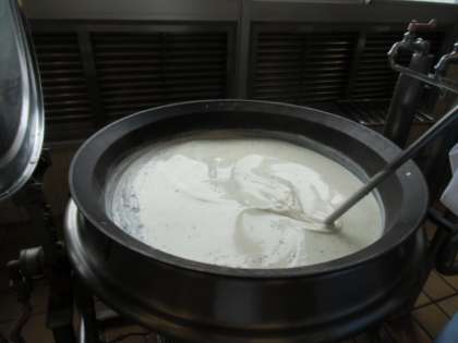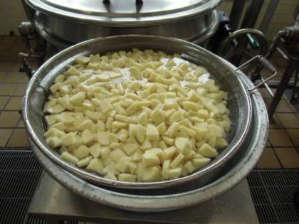 今日は、じゃがいも22kgを蒸してから、炒めた玉ねぎやベーコンと一緒にミキサーにかけてなめらかにし、24kgの牛乳と一緒に火にかけてポタージュスープを作りました。