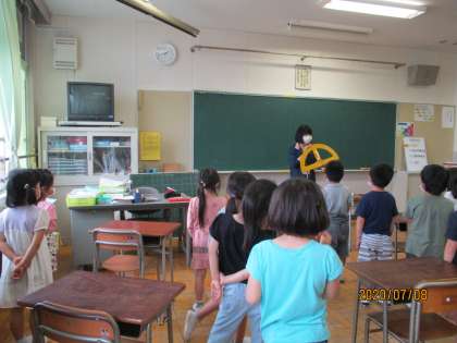 5じかんめは、さんすうきょうしつに たんけんに でかけました。おおきな ぶんどきを みて、「まるいじょうぎだ。」と おどろいて いましたね。うらかわせんせいが、おおきな こんぱすを つかって、きれいな まるを かいてみせて くださいました。みなさんも はやく、ぶんどきや こんぱすを つかって、べんきょうしてみたいですね。