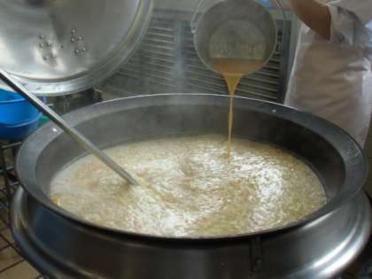 かきたま汁は、だし汁で具材を煮た後にでんぷんでとろみをつけ、最後にたまごを少しずつ入れて仕上げます。写真の2枚目は回転釜にたまごを少しずつ入れているところです。生の卵を衛生に気をつけて取り扱うために、決められた調理員さんが、専用のエプロンに付け替えて釜の後ろ側を通って卵を運んできます。その後、ゆっくりと釜に入れていきます。