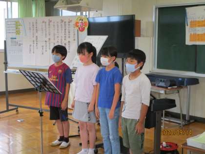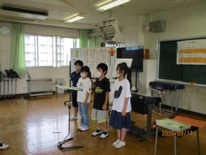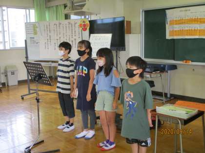9月14日(月) 音楽科より「歌の発表会(4年生)」 公開日 2020/09/14 更新日 2020/09/14 専科 今日は、「ゆかいに歩けば」の歌のグループ発表会でした。 どう歌いたいかを考えた後、うまくなるコツを学びグループで練習してきました。それを4人から5人のグループで発表しました。 「前にでると声が出ない」という子もいましたが、めあてを自分で決め、歌をグループで練習するというレベルの高い学習にチャレンジできた4年生。よく頑張りました! いいね(0)