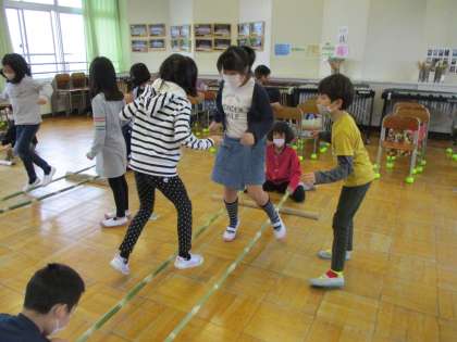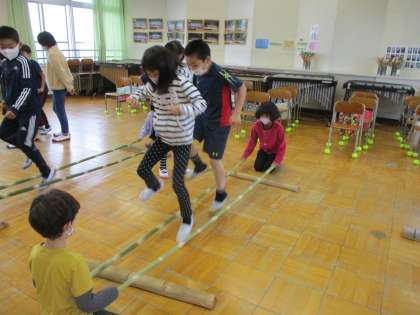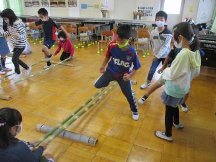 3年生は、「世界の遊び歌」を鑑賞した後、アジアの音楽で楽しんでいます。写真は竹を使ってフィリピンのバンブーダンスを楽しんでいる3年1組の様子です。3拍子にのれず、動けなかった子や、竹に挟まれそうで怖がっていた子もいましたが、全員がチャレンジできて、だんだん上手になってきました。