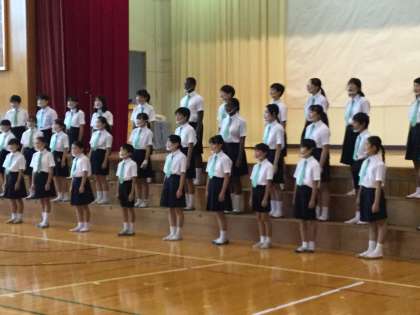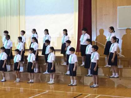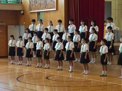 合唱団「合唱 金色の実」 4年生以上の子供たちによる合唱です。身に付けているネクタイは、以前紹介した「プロバスクラブ」の方々からいただいたものです。合唱団の歌声にネクタイの色がぐんと映えました。