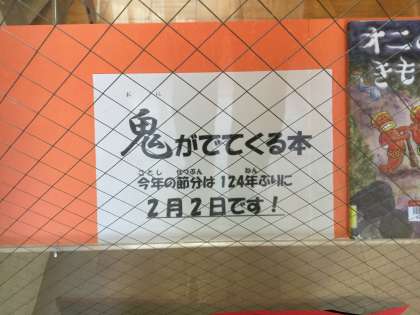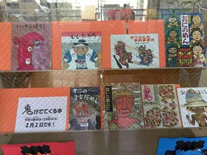 図書室の本の紹介コーナーにも節分にちなんで『鬼』がでてくる本が展示されています。こわ〜い鬼からこころやさしい鬼、物語を通してふれあってみてください。残念ながら人気マンガはありません。