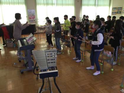4年生の音楽では「茶色の小びん」の合奏に取り組んでいます。鍵盤楽器である鉄琴や木琴のパートをみんなで練習しました。マレット(ばち)の持ち方から膝をつかった打ち方など学ぶことがたくさんありました。