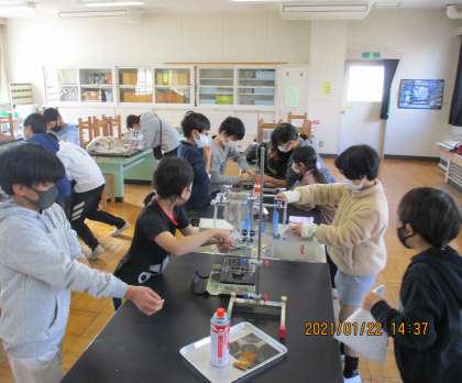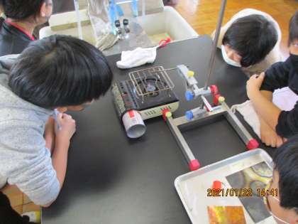 1月22日(金) 4年生のみなさんへ 公開日 2021/01/26 更新日 2021/01/26 第4学年 今日は、もののあたたまり方の実験を行いました。 金ぞくを熱すると、どのように熱が伝わっていくのか予想をたて、たしかめてみましたね。ろうをぬって熱すると、それがとけていく様子におどろきました。 次回はどんな実験をするのか楽しみですね。 いいね(0)