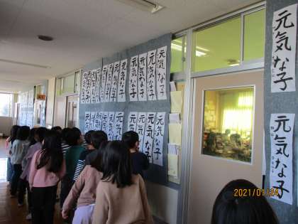 1,2年生のこうひつかきぞめは、みんな お手本をよく見て