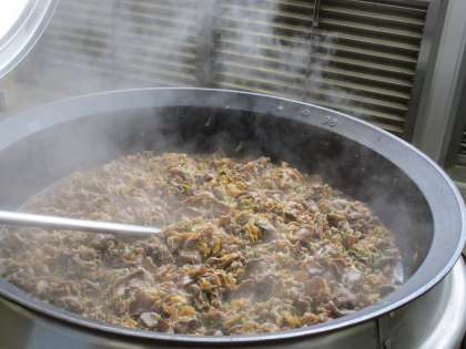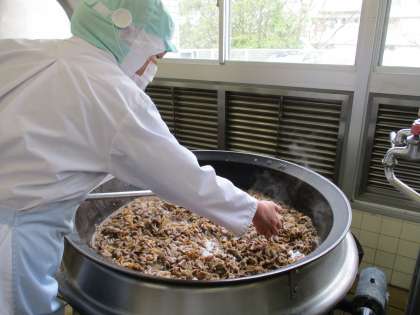 だし汁で玉ねぎを煮て調味料を合わせた中に、さっと湯通しした肉を入れ、肉が固くならないように火を通していきました。最後にしっかり温度も確認して各クラスに配缶していきます。