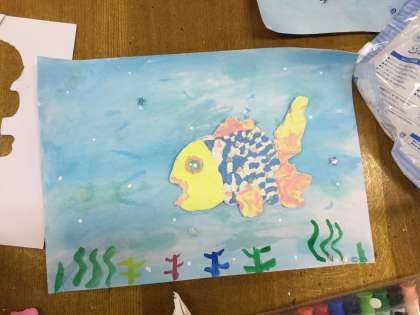 すてきなおめかしした魚を考えました。自分作った色粘土で魚をつくります。背景の海の中の様子も一人一人個性的です。いくつか紹介いたします。
