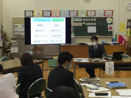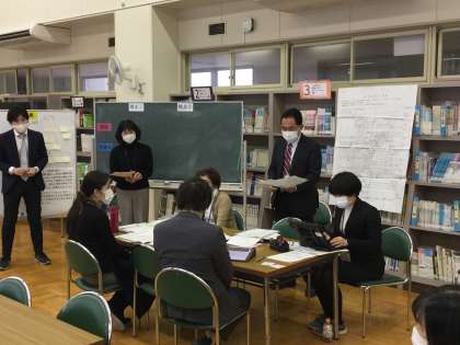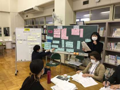 今日の授業を見て、2つの視点に沿って、先生方が互いに意見を言い合い、深めました。講師の先生から、今日の授業について、教材の分析、解釈の仕方などを改めてご教授いただきました。