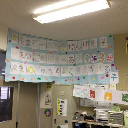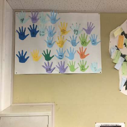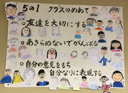 どのクラスにもあるのが学級目標。年度の初めに、教員と子供たちが話し合って決めたものです。自分たちで決めたことですから、様々な機会にそれを振り返り、自らの成長につなげていきます。