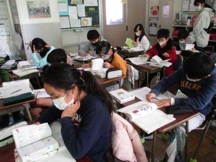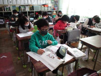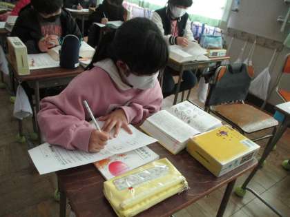 1月30日(土) 4年国語 公開日 2021/02/02 更新日 2021/02/02 第4学年 国語「故事成語」の学習の様子です。 ことわざや慣用句は知っている子が多かったのですが、故事成語は「初めて聞いた!」という子がほとんどでした。 「五十歩百歩」や「漁夫の利」「蛇足」などの意味について、国語辞典やことわざ四字熟語辞典を引いて、熱心に調べました。 いいね(0)