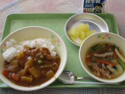 今日の給食は子どもたちに人気のカレーライスでした。学校のカレーは、ルーを手作りしています。小麦粉、バター、油、カレー粉を釜で良く炒めます。調味料には、ケチャップ、ウスターソースも入り、りんごのすりおろしも隠し味になっています。詳しいレシピは、このホームページの給食の記事、一番はじめの「給食レシピ1」に掲載していますのでご覧ください。
