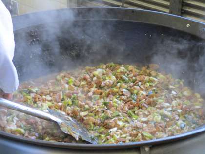 今日は、旬のながねぎをたっぷり使った献立でした。やきとり丼に13kg、たら汁に7kg、合わせて20kgのながねぎを使いました。ねぎには、大きく分けて、根元の白い部分を食べる「根深ねぎ」と、葉の部分を食べる「葉ねぎ」があります。一般的にながねぎと呼ばれるのは、根深ねぎのことです。生で食べると辛みがありますが、煮込むと甘くとろりとした口当たりになります。